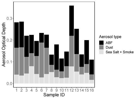 Aerosol optical depth (AOD) from Navy Aerosol Analysis and Prediction System (NAAPS) reanalysis at the time of collection at sample sites. Each bar represents one sample, with the height of each bar corresponding to total AOD. ABF (anthropogenic and biogenic fine aerosol species) in black, mineral dust in dark gray, and sea salt + and smoke in light gray, fractions of the total AOD are shown for each station.