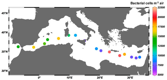 Bacterial abundances in our samples ranged from 103 to 104 cells m−3 air (Figure 3). The highest abundance of bacteria was measured in sample 6 in the Central MS (2.12 × 104 cells m−3 air), near the island of Crete, during the arrival of the tail of the dust storm that originated from North Africa. The lowest abundances were measured in the Central and Eastern Mediterranean (6.64 × 103 to 7.17 × 103 cells m−3 air) in samples 9 and 4, respectively. Bacterial abundances in aerosols collected over the MS were in agreement with previous studies from the eastern Mediterranean coast [10] and the Atlantic, Pacific, and Indian ocean basins [1], yet were lower than those reported in the East China Sea [54] and the Red Sea [55]. Rahav et al. [10] measured the abundance of airborne prokaryotes at a coastal site located at the easternmost MS during 34 sampling events (between 2015 and 2018) and found that abundances were positively correlated to the concentration of aerosols in the air (mg m−3 air). Here, however, we did not find such a correlation, likely because the range of concentrations during non-dust-storm conditions, represented by our samples, was relatively small in comparison to previous studies. Mayol et al. [1] measured bacterial abundances in the Atlantic, Indian, and Pacific Ocean basins and found that sites closer to land (including islands) had significantly higher numbers of airborne microbes (normalized to the aerosol mass) than those further away from landmasses. This was also not observed in the MS, possibly because the MS is surrounded by land, and all sampling sites are relatively close to land when compared to samples obtained in the open ocean by Mayol et al. [1].