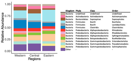 The relative abundances of the “Common” orders of bacteria in each region of the MS (Eastern, Central, Western) are shown in a bar plot (Figure 4), with rare bacteria (constituting less than 5% of all samples) grouped into “other”. The Eastern MS had a higher relative abundance of Bacillales, Salinisphaerales, and Enterobacteriales, and lower relative abundances of Clostridiales and Saprospirales than the Western and Central regions (Figure 4). The most abundant bacteria found over the MS were Firmicutes (Bacilli and Clostridia) and Proteobacteria (Alphaproteobacteria, Betaproteobacteria, and Gammaproteobacteria) (Figure 4). The Firmicutes and Proteobacteria families we found over the MS have previously been isolated from variable habitats, including soil, plant microbiota, aquatic (including marine) and thermal environments, and human and animal microbiota (Figure 4, Supplementary Table S2). This suggests that the bacterial community of the MS air during non-storm conditions are not tied to one habitat source. The organisms that were significantly more abundant during higher concentrations of dust (Bacillaceae, Paenibacillaceae) are both from the Bacillales order and are terrestrial microbes, commonly found in soil and plant microbiomes (Supplementary Table S2). This is consistent with data from coastal Mediterranean aerosol studies conducted during dust storms [3,31,32,57,58], which also reported the presence of Bacillaceae in the air during storm events. Certain bacteria were more abundant in samples with high concentrations of ABF (Chitinophagaceae, Staphylococcaceae, Planococcaceae, Turicibacteraceae). However, these organisms are found in a wide array of habitats, and thus implication of their association to high concentrations of ABF is not as clear.