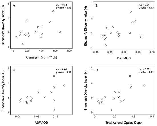 The relationship between bacterial diversity (Shannon’s diversity index) and atmospheric aerosols variables, (A) aluminum, (B) dust, (C) ABF, (D) total aerosol optical density.