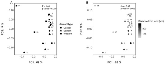 To quantitatively assess the diversity and estimate the differences in airborne bacterial communities over the MS, we report microbial community richness, expressed as the number of unique OTUs observed, and diversity expressed as Shannon’s diversity index (H), estimated from the abundance of bacteria in each sample (Table 1). Observed OTUs corresponds to the number of unique bacteria in each sample, whereas H is a commonly used quantitative measure of diversity [49]. The abundance of observed OTUs ranged from 66 (sample 9) to 241 (sample 1) (Table 1). Observed OTUs varied significantly between the three regions of the MS: Eastern (median = 141), Central (median = 93), and Western (median = 82) (Kruskal–Wallis pairwise test: H = 6.732, df = 2, p = 0.034) (Table 1) and correlated positively to Al concentration (Spearman correlation: = 0.549, p = 0.028), mineral dust AOD (Spearman correlation: = 0.68, p = 0.003), ABF AOD (Spearman correlation: = 0.538, p = 0.031), and total AOD (Spearman correlation: = 0.70, p = 0.002) (Table 1). The diversity ranged from 5.17 (sample 9) to 7.48 (sample 1) (Table 1). H values were positively correlated to mineral dust (Spearman correlation: = 0.547, p = 0.028), ABF (Spearman correlation: = 0.599, p = 0.014), and total AOD concentrations (Spearman correlation: = 0.653, p = 0.007) (Figure 5). Prokaryotic communities from samples within the Eastern MS were significantly more similar to each other than samples from the Western MS (PERMANOVA: F = 1.83, p = 0.009) (Figure 6A). Moreover, distance to land, including islands, was positively correlated to community similarity (Spearman: = 0.377, p = 0.009) (Table 1, Figure 6B), even though the bacterial abundance did not correlate to distance to shore.