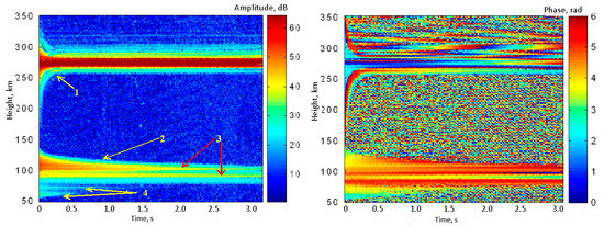 The time-height-amplitude plot of the artificial periodic irregularity (API) scattered signal during the relaxation process of irregularities (the left panel). A fast relaxation the API signal in the F-region—1; API scattered signal in the stratified D-region of the ionosphere—4; API scattered signal in the E-region—2 and in the sporadic E-layer—3. The time-height-phase plot is shown on the right panel.