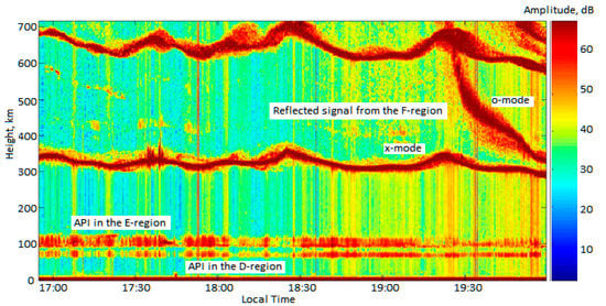 Figure 2 shows the time-height-amplitude plot of the API scattered signal obtained on 9 August 2017. The ionosphere signals reflected from natural regions of the ionization and API scattered signals in the D-, E-, and F-regions are visible.