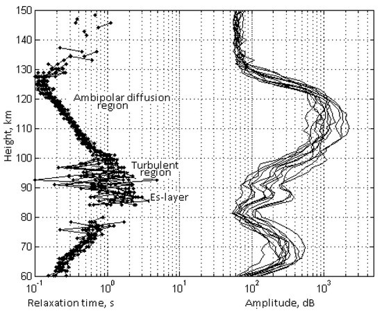 Height profiles of the API scattered signal characteristics as the relaxation time τ (left curves) and the amplitude A (right curves), obtained 30 September 2016 in session 13:54–13:58, are presented in Figure 3. The API scattered signal amplitude reaches a maximum in the E-region, where the signal-to-noise ratio is 10:100. In this example, at the height range of 95–125 km, the API relaxation process occurs under the impact of ambipolar diffusion and values of relaxation times are in good agreement with the diffusion dependence τ(h). Below 100 km, atmospheric turbulence begins to impact on the relaxation process. Irregularities break down faster and the relaxation time of the scattered signal decreases as compared with the diffusion time. In the D-region, the amplitude and relaxation time change with height, in full accordance with the dependence detachment coefficient from the electron temperature [8]. The pattern of the temporal variations of the relaxation time determines the corresponding variations in the temperature and density of the neutral component.