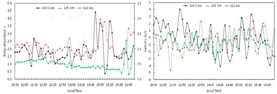 In Figure 4, temporal variations of the API relaxation time and the vertical plasma velocity at the heights of 100.8 km, 105 km, and 112 km for 25 October 2018 are shown. The relaxation time decreases strongly as height increases, so the right vertical axis of coordinates is related to the green curve for convenience. It is seen that both the API relaxation time and the vertical plasma velocity present wavelike time variations. Elevated relaxation times appear when a sporadic E-layer exists during the observations [8,24,30]. The existence of a sporadic layer during the experiments is confirmed by ionograms of vertical sounding of the CADI ionosonde at the location near the Sura facility [30].