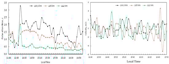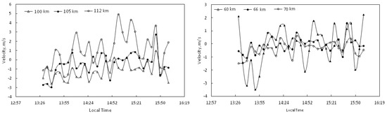 Figure 6 presents the temporal dependence of vertical plasma velocity values averaged over 5 min on 28 September 2018 for three heights of the E-region at 100 km, 105 km, and 112 km (left panel), and for the D-region at 66 km, 76 km, and 85 km (right panel).