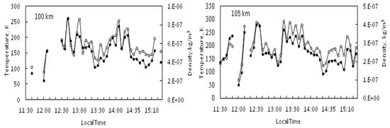 The temporal dependencies of the temperature and the density of the neutral component for two heights at 100 km (left panel) and 105 km (right panel) in daytime hours on 28 September 2018. Each point corresponds to the average of the primary data over a time interval of 5 min.