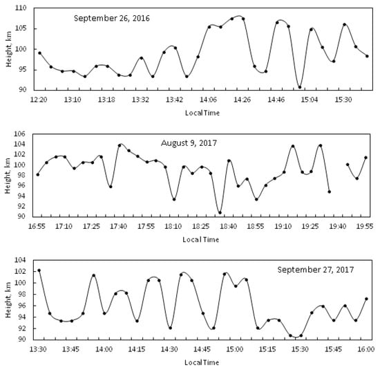 The turbopause level can be defined as a height in the ionosphere, below which turbulent mixing predominates, and molecular diffusion is dominant above it. Turbulent structures can be transported to the lower thermosphere by vertical motions and atmospheric waves. The turbopause level varies depending on the time of day. The method of turbopause level determination on the basis of the API technique is discussed in [32]. API observations show that relaxation time decreases with increasing altitude, in accordance to the ambipolar diffusion law (Figure 3). Below the turbopause level, turbulent mixing begins; this height we consider as the turbopause height. For example, in Figure 8, variations of the turbopause height determined by this method for three days of the API observation are presented.