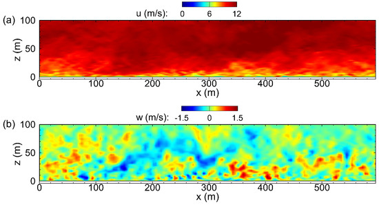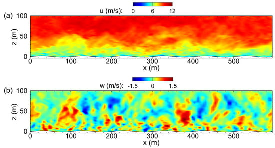 - Sullivan, P.P.; McWilliams, J.C.; Patton, E.G. Large-eddy simulation of marine atmospheric boundary layers above a spectrum of moving waves. J. Atmos. Sci. 2014, 71, 4001–4027. [Google Scholar] [CrossRef]