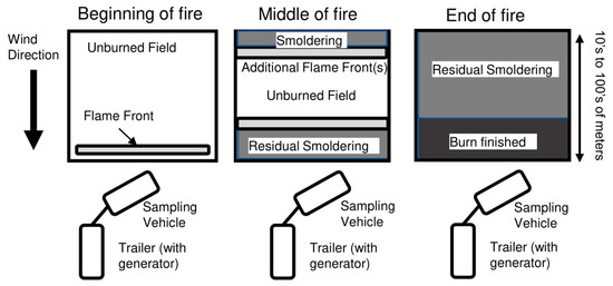 Diagram of sampling arrangement during burns, illustrating the relationship between the evolving flame front, the sampling trailer, and the generator relative to the wind direction.