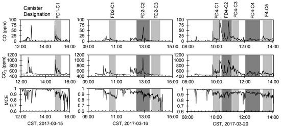 Continuous timeseries of CO, CO2, and MCE for the three days we sampled VOC canisters. Canister sampling periods are shaded and labeled with the canister designation above the CO timeseries.