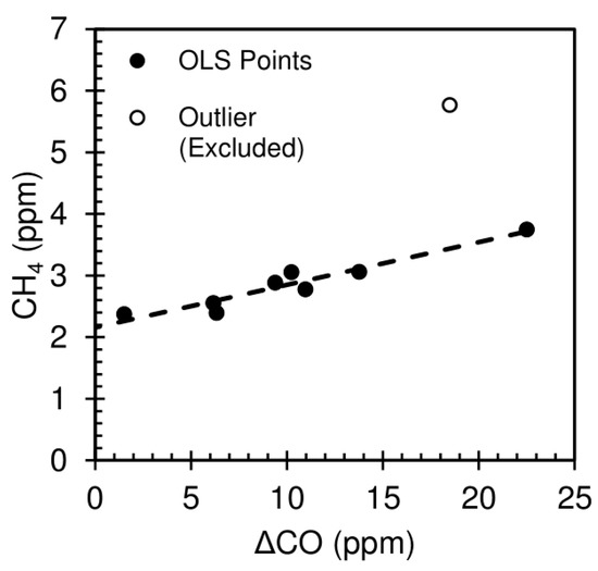 Methane (CH4) emission ratios (relative to CO from the canisters) and background values were determined using an ordinary least squares linear regression of ΔCO versus CH4. Of the 9 points, 8 lay on a line and the ninth (FD4-C1) is a high outlier (Figure 3). We hypothesize there to be an additional source of methane contributing to FD4-C1. Therefore, we calculated the regression of ΔCO versus CH4 for the other 8 samples and excluded the outlier sample from analysis. The OLS regression gave a slope (CH4ERCO) value of 0.0693 (0.0485, 0.0902, 95% CI) and an intercept (background CH4) of 2.1558 ppm (1.9123, 2.3993). Therefore, our best estimate of the CH4ERCO = 0.0693, with a 95% confidence interval of (0.0485, 0.0902). Raw methane concentrations from each canister are given in Table S5. VOC emission ratios are discussed in Section 3.2.