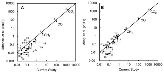 (A) Comparison of emission factors for CO, CO2, and VOCs obtained in the current study with those reported by [40]; and (B) comparison of emission factors for CO, CO2, and VOCs obtained in the current study with those reported by [41]. Points are labelled with numbers that correspond with the Species Number in Table 1.