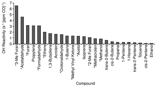 OH reactivity of the measured VOC compounds can be determined from the measured concentrations (or emission ratios) and the rate factor of each compound with OH [48]. VOC OH reactivity is dominated by the short chain (C2 + C3) alkenes, as well as isoprene and acrolein. Propylene dominates the OH reactivity of the measured compounds (26.8%), with 1,3-butadiene (15.4%), acrolein (14.8%), and 1-butene (12.2%) also accounting for significant portions. Combined with isoprene (10.8%) and the 2-butene isomers (8.5%), these compounds account for 88.5% of the OH reactivity of measured compounds. The total OH reactivity of the measured VOCs is 11.4 s−1 [ppm CO]−1. Assuming similar emission factors to the “Pasture Maintenance” fires from [41] (see Section 4.2), we can estimate emission ratios and contribution to reactivity from unmeasured compounds. We used the emission factor values for ethene, methanol, acetol, and several reported ketones, aldehydes, and furans from [41] to compute the estimated contribution of those compounds to VOC OH reactivity as well. Of these compounds, ethene (2.0 s−1 [ppm CO]−1), formaldehyde (3.1 s−1 [ppm CO]−1), acetaldehyde (4.6 s−1 [ppm CO]−1), furan (3.1 s−1 [ppm CO]−1), and 3-methyl furan (6.5 s−1 [ppm CO]−1) contributed the most to VOC OH reactivity. Total VOC OH reactivity of the measured and estimated compounds is 38.2 s−1 [ppm CO]−1. Contributions to OH reactivity from individual measured or estimated species are shown in Figure 5.