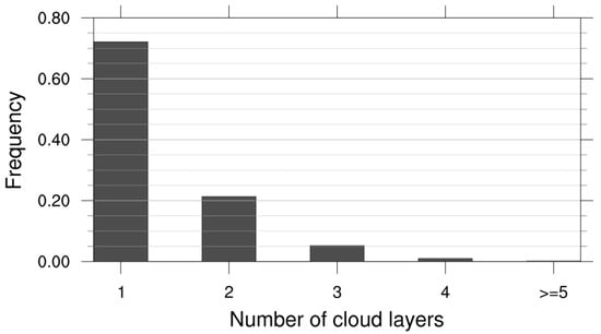 In a CPR profile, successive cloudy bins are considered as a cloud element, which actually represents a sampling column in a broad domain of a real cloud layer. Given such measurements, single-layered or multilayered clouds are readily derived by summarizing all 125 bins. This is very useful for quantifying the overlapping characteristics of clouds over the global oceans. Without any restriction on cloud type, the frequencies of all cloud profiles with one or more cloud layers are shown in Figure 1. It is evident that single-layered clouds are the dominant cloud form. Multilayered clouds occur more infrequently, but they cannot be ignored due to their nearly 30% contribution. Double-layered clouds account for about 20% of the total cloud profiles. This percentage of double-layered clouds is lower than ~26% from Wang et al. [19], which could likely be attributed to the land-ocean contrast. It is very likely that double-layered clouds occur more frequently over land than over ocean. Since the overall frequency of cloud appearances with three or more individual layers is below 10%, double-layer is indeed the predominant form of multilayered cloud systems. Only single-layered and double-layered ones were analyzed in this study while taking into account such a sample distribution.