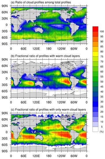 The cloud profiles were divided into two parts, according to the presence or absence of warm cloud layers. The first one includes those without any warm cloud layer, while the other includes those containing at least one warm cloud layer. Within the latter group, there is a distinctive subgroup that includes profiles containing only warm cloud layers. It is this subgroup that corresponds to the warm clouds that are derived from the cloud top temperature criterion of 273 K. In other words, the ratio of these two kinds of profiles reflect, to some extent, the possible biases in warm cloud sampling from the cloud top temperature scheme. The global distributions of the relevant ratios are shown in Figure 2 to clarify the quantitative relation among these categories.