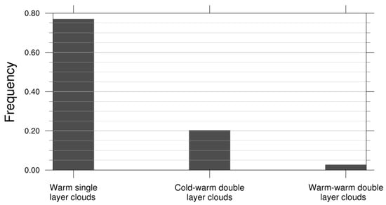 The warm cloud layers, either in the form of a single-layered cloud system or as an individual layer in a multilayered cloud system, are thus extracted to ascertain their occurrence frequency, characteristics, and geometric features. In most investigations involving warm clouds, in particular those that are based on radiometer measurements, a cloud top temperature of 273 K [24] is a standard criterion for isolating warm clouds that are only composed of liquid-phased hydrometeors. However, in the presence of multilayered clouds, it is hard to correctly interpret the derived cloud top temperature, since a single-layer assumption is generally adopted to make the cloud retrieval feasible. It is plausible to take the retrieved cloud top temperature as representing the uppermost cloud layer in an atmospheric column. However, this treatment inevitably causes ambiguities that would deteriorate as the optical depth of the upper cloud layer gets smaller [27]. Even though the retrieved cloud top temperature is sometimes right for the uppermost cloud layer, the cloud top temperature of the lower cloud layers is always unknown. Therefore, such a cloud top temperature-based scheme cannot capture all warm cloud layers and many samples would be ignored. Many warm cloud layers would be lost due to the overlap of an upper cloud layer with cloud top temperature lower than 273 K. This is actually one of the several motivations for the present study, which is designed to investigate warm clouds that are embedded in multilayered structures.
