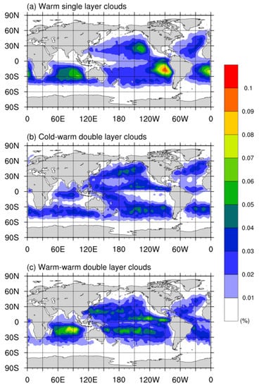 Furthermore, Figure 2c shows the ratios of profiles with only warm cloud layers to those with warm cloud layers. The regions with high quantities are almost consistent with those of warm cloud fraction. Their spatial correlation is high, with a correlation coefficient of about 0.76. In the five regions, the maximum quantities exceed 90%. However, it is noteworthy that the quantities are not very low in other regions, mostly above 50%, which implies ubiquitous occurrences of the overlapping of low-level warm clouds and upper non-warm clouds on the global scale. In the zone between 60°N and 80°N, although the profiles with warm cloud layers are few, this fractional ratios are a bit notable. There are exceptionally low values over the narrow regions adjacent to west coast of continents. These should be attributed to the deficiency of CPR for detecting clouds at very low levels, which are mostly coastal stratus and they occur very frequently in these regions [24,28,29].