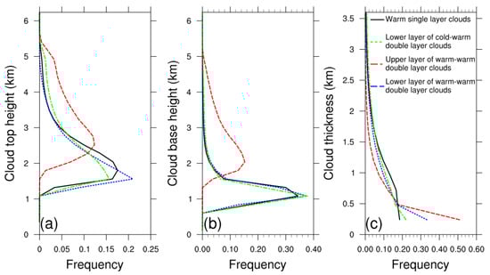 Frequency distribution of cloud top height (a), base height (b), and geometric thickness (c) of the four types of warm cloud layers.