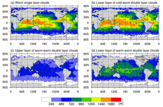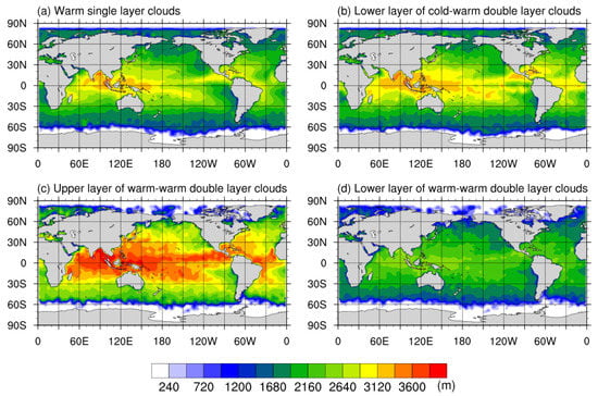 Global distribution of cloud top height for warm single layer clouds (a), lower layer of cold-warm double layer clouds (b), upper layer of warm-warm double layer clouds (c), and lower layer of warm-warm double layer clouds (d).