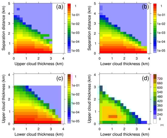 Sample frequency in the two-dimensional space of upper cloud thickness and separation distance (a), lower cloud thickness and separation distance (b), lower cloud thickness and upper cloud thickness (c), and the variation of separation distance depending on lower and upper cloud thickness (d), for warm-warm double layer clouds.