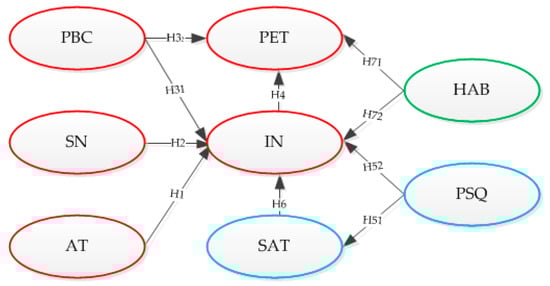 As stated above and defined in Table A1 in the Appendix A, we introduce satisfaction (SAT) and perceived service quality (PSQ) of PT to reveal a more comprehensive and effective explanation of PET behaviour. As a result, three hypotheses are formulated as follows: