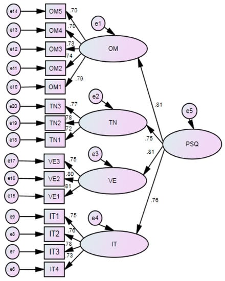 Due to a lack of standardised mature scales for the measurement of transport service quality, we carried out an exploratory factor analysis to further verify the applicability of the scale. Before this analysis, we used the Kaiser-Meyer-Olkin (KMO) test and Bartlett’s test of sphericity on the items relating to transport service quality. The value of KMO was greater than 0.916, while the chi-square for Bartlett’s test of sphericity was 3018.256. This means that the requirements for the confidence coefficient are satisfied and the model makes sense in terms of factor analysis. Using SPSS 20.0 software and the principal component method, 4 factors with eigenvalues greater than 1 were extracted. These were VE, TN, OM and IT. The cumulative explanatory variance was 68.956%. The factor load matrix after orthogonal rotation is shown in Table A4 in the Appendix A, and the load of each index is greater than 0.5.