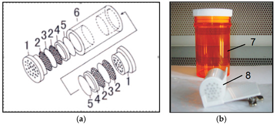 Ogawa passive sampler components: 1—Inlet; 2—Stainless Steel Screens; 3—Collection Pad; 4—Ring; 5—Backing Tab; 6—Body; (a) [22]. 7—Plastic Sample Container; 8—Assembled Sampler (b).