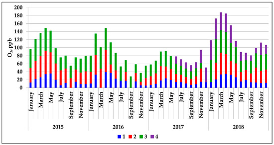 Inter-annual ozone concentration dynamics at the Irkutsk (1), Listvyanka (2), Mondy (3) and Bugul’deyka (4) monitoring sites sampled by the passive sampling method, 2015–2018.
