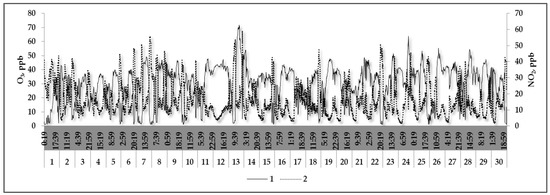 According to Figure 2, at site Irkutsk during the spring maximum period, the ozone concentration reaches (≈45 ± 10) ppb, however, during the autumn minimum, this concentration falls to (≈10 ± 2) ppb. The main cause of the low ozone concentration under urban conditions may be the increased sink in the atmosphere, due to the oxidation of anthropogenic gases. As an example, Figure 3 presents a fragment of the joint automatic registration of the ozone and nitrogen dioxide concentrations at Irkutsk in April 2015.