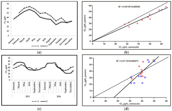 To confirm the validity of sampling by the passive method, we conducted a statistical analysis with the data obtained from the direct measurement of the ozone concentration at site Listvyanka (Figure 4a,b). The two methods exhibit good convergence with a high correlation coefficient (r > 0.9). At the background site Mondy, the link between the results obtained by passive and forced sampling methods in 2015–2016 is less strong, with a correlation coefficient of r > 0.7 (Figure 4c,d).