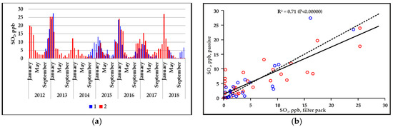 Seasonal variability of the sulfur dioxide concentration at the Irkutsk monitoring site, shown in (a); correlation of the concentrations obtained using the passive sampling and filter pack methods (b). 1—Passive method; 2—Filter pack method. The red circles on the graph show the data obtained during the two-week exposure of the passive sampler, and the blue circles show the data obtained during the monthly exposure of the passive sampler, while the solid line is the graph of the estimated regression model, and the dotted line is the expected relationship with slope = 1 and intercept = 0. The graphs show the quality value of the linear approximation R2 and its statistical support P.