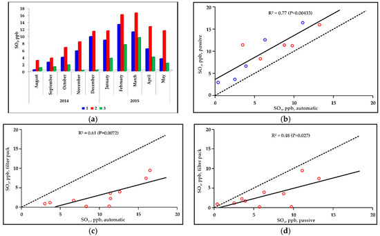 Sulfur dioxide concentration at the Irkutsk monitoring site in 2014–2015, shown in graph (a); correlation of the concentrations obtained using the automatic measurement and passive sampling methods shown in (b); concentration interconnection using the automatic measurement and samples selected by filter pack method (c); concentration interconnection using the passive measurement and samples selected by filter pack method (d). 1—Passive method; 2—Automatic method; 3—Filter pack method. In the figures (b–d), the red circles show the data obtained with a two-week exposure of the passive sampler, the blue circles (b) show the data obtained with the monthly exposure of the passive sampler. The solid line is a plot of the estimated regression model, the dotted line is the expected relationship with slope = 1 and intercept = 0. The figures show the value of the quality of the linear approximation R2 and its statistical support P.