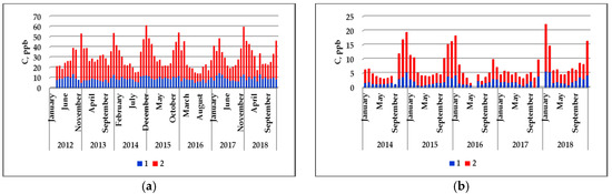 NOx measurements commenced following the passive sampling method at the Irkutsk monitoring site in 2012 (Figure 7a) and at Listvyanka in 2014 (Figure 7b). We obtained a large number of pollutant concentration observations in the surface atmosphere in both urban and rural areas.