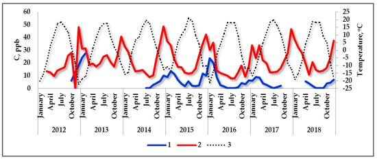 According to the seasonal dynamics of the SO2 concentration, at the Irkutsk site the maximum concentration was observed during winter (≈20 ± 5) ppb, while the minimum was observed during the warm period (≈2.0 ± 0.5 ppb; Figure 5a).