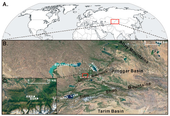 (A) Location of the study area. (B) Map of the study area. The area of the selected gridded climatic data (45°–46° N, 79°–81° E) is represented by the white dashed rectangle. (C) Sampling sites: Amanboktek (AMA) and Basika (BSK).