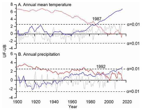 Results of Mann–Kendall tests for (A) annual mean temperature and (B) annual precipitation (1901–2016).