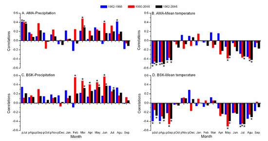 Pearson correlations between the tree-ring chronologies and climatic data (precipitation and mean temperature) in the periods 1962–1988 (blue bars), 1990–2016 (red bars), and 1962–2016 (black bars): (A) AMA and precipitation, (B) AMA and mean temperature, (C) BSK and precipitation, and (D) BSK and mean temperature.