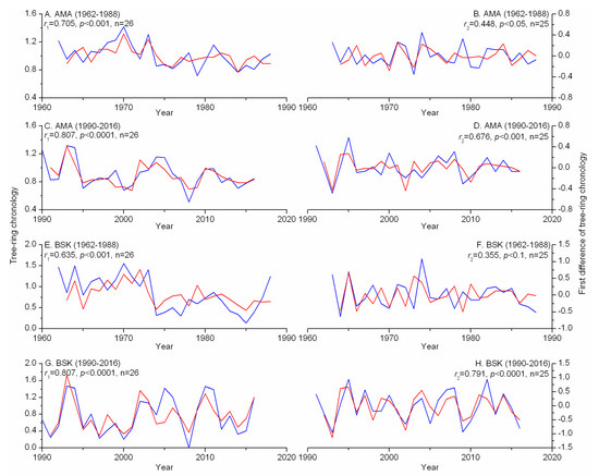 where n = 26, r1 = 0.807 (p < 0.0001), r2 = 0.791 (p < 0.0001), R2 = 65.2%, R2adj = 58.5%, SE = 0.291, F = 9.813, and D/W = 1.530, and where CAMA (1962–1988), CAMA (1962–1988), CBSK (1962–1988), and CBSK (1990–2016) represent the calculation of the AMA and BSK chronologies in the two periods 1962–1988 and 1990–2016, and P and T refer to monthly precipitation and mean temperature, respectively. The subscripts for P and T are abbreviations of given months and the p before the abbreviation denotes a month in the previous year. Statistics related to each model comprising the correlation coefficients of the original (r1) and the first difference (r2), R2, R2adj, standard error (SE), F-value (F), and Durbin–Watson (D/W) statistic are listed following the equations. Equations (4) and (6) accounted for 65.1% and 65.2% of the variance in the AMA and BSK chronologies during the calibration period 1990–2016; the variance explained by Equations (3) and (5) was 49.7% and 40.3% in the calibration period 1962–1988. Figure 6 shows that the simulated chronologies have a good match with the calibration in the original and first difference domains in the period 1990–2016, while the coherences between the simulation and the calibration for two tree-ring chronologies are obviously weak in the period 1962–1988, especially in the first difference domain. The above results of the correlation analysis, u test, and simulation of tree-ring chronologies indicate that the climate response of the radial growth of the spruce growing in the study area has obviously strengthened after the abrupt change of climate.