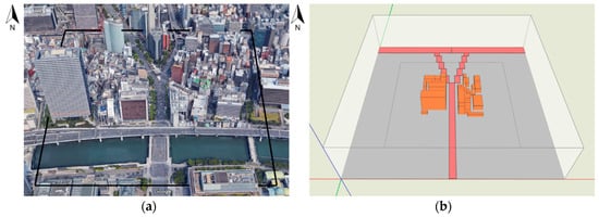 Figure 1b). The information about the length, width, and height of every building was obtained by the results of the survey on land use conducted by Osaka City in 2005. The height of the array of buildings was from 12 to 48 m.