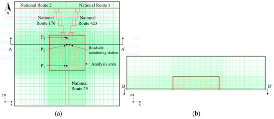 The emission rate from vehicles used as CMAQ input data was derived from JEI-DB with a horizontal resolution of 1 km × 1 km. The total emission rate from automobiles in the CFD domain was estimated from the JEI-DB data by multiplying the area ratio of the CFD domain to a grid of JEI-DB (0.36). Then, the total emission was allocated into the five national routes shown in