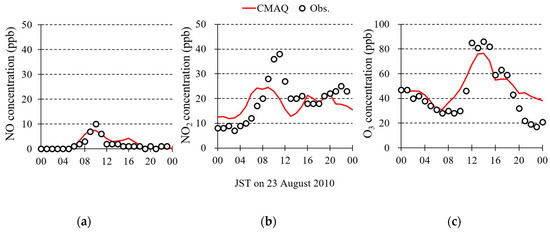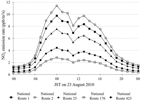 Figure 7). At 16:00 JST, the vehicle emission rate decreases, and the wind speed is higher, so the NO