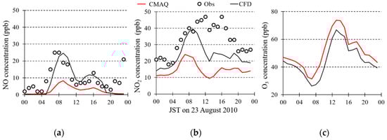 Figure 6, the validation of the CFD model coupled chemical reaction model (CBM-IV) against CMAQ-simulated and the roadside monitoring station data by the Atmospheric Environmental Regional Observation System (AEROS) at Umeda-Shinmichi station (34.69° N, 135.50° E) about the diurnal variations of NO and NO