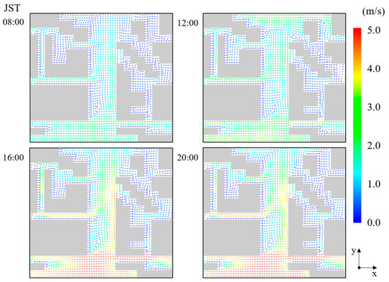Figure 7 shows the airflow pattern in the analysis area at 08:00, 12:00, 16:00, and 20:00 JST in cross-section B-B’ (