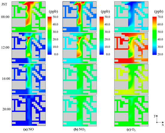 2 remained in the middle of the street canyon because building configurations do not allow their removal. During the day, the behavior of the contaminants changes depending on the emission rates and wind velocity. During the morning rush hours (07:00–09:00 JST), the NO
