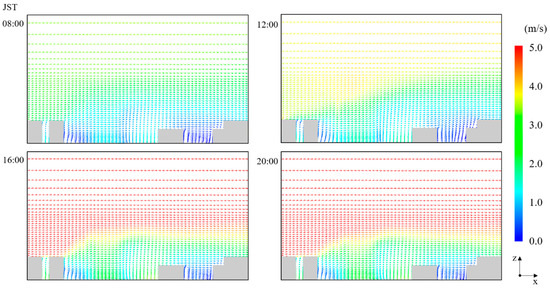 Figure 9 shows the airflow patterns at 08:00, 12:00, 16:00, and 20:00 JST in cross-section A-A’ (