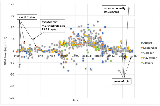 Scattering of GEM fluxes for all the months during the day is represented in Figure 1, along with the rain events that happen in each case. Negative GEM fluxes that are related to rain events and measured right before or during the rain event cannot be explained by the deposition of elemental mercury, as mercury in rainwater mainly has the form of reactive-oxidized and particulate mercury. In addition, the vapor mercury instrument measures only elemental mercury. The possible explanations could be the transported mercury from a nearby area where the mercury evaporated from the soil due to the rain event or the co-precipitation of GEM with condensing water. The positive GEM fluxes follow the rain events with a time lag of a few minutes. A factor that contributes to the positive fluxes is the meteorological conditions, such as solar radiation, temperature and relative humidity, which may affect the conversion of Hg2+ to Hg0 on the soil and the rate of volatilization during and after wet deposition [38]. The volatile Hg0 that remains on the soil is induced to evade after the rain event due to the water and the humidity on the soil. According to [39], the increased fluxes of Hg0 from the bare soils during the precipitation and the peak in Hg0 emissions during the rain events are affected by the displacement of soil air pores containing Hg0 by rain water and the enhancement of Hg0 fluxes after the precipitation are dependent on soil moisture before the rain event, with greater flux a result of having drier soil. In our case, there are no increased positive fluxes during the rain events, but, right after these events, which is in agreement with [40], where except for the greater rate of Hg0 fluxes from desert soils, the emissions after the rainfall were one order of magnitude greater than those measured prior to the precipitation.
