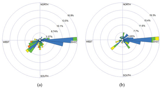 Gaseous elemental mercury (GEM) fluxes rose plots for (a) emissions and (b) depositions. The GEM fluxes are divided in the following classes in absolute values: blue for 0-20 ng m−2 h−1, green for 20–40 ng m−2 h−1, yellow for 40–60 ng m−2 h−1, orange for 60–80 ng m−2 h−1 and red for fluxes greater than 80 ng m−2 h−1.