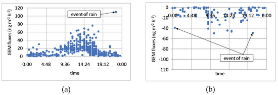 Gaseous elemental mercury (GEM) fluxes (ng m−2 h−1) during the day for the entire period of measurements in (a) for emissions and (b) for depositions.