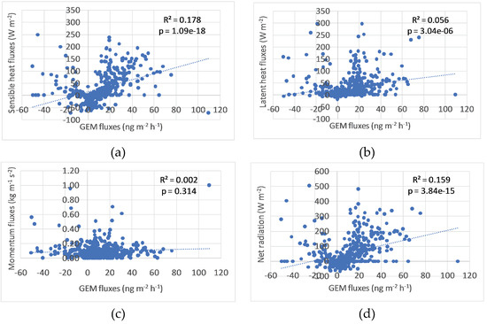 Energy fluxes: (a) sensible heat fluxes; (b) latent heat fluxes; (c) momentum fluxes and (d) net radiation plotted against gaseous elemental mercury (GEM) fluxes.
